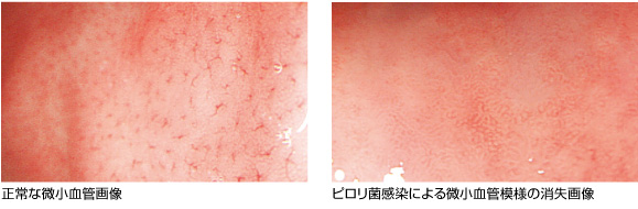 従来、ピロリ菌感染の検査は、尿検査や胃の組織検査、吐く息に含まれるアンモニアの検査(呼気テスト)などに頼ってきました。当院では、鮮明なハイビジョンズーム内視鏡を用いることで、胃の表面でピロリ菌に荒らされた範囲の判定をできるようになりました。